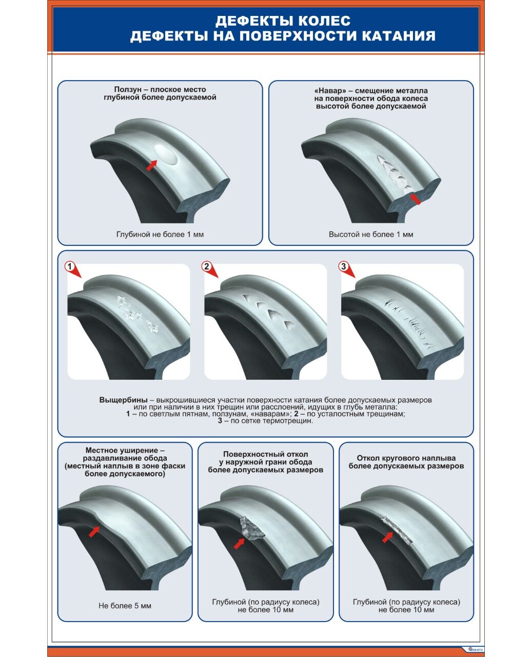 Дефекты цельнокатаных колес. Дефекты на поверхности катания. (600 х 900 мм, ламинированный, с пластиковым профилем и стальным крючком)