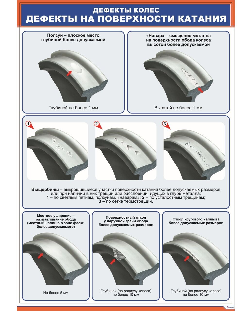 Плакат: Дефекты колес. Дефекты на поверхности катания (8 рис) (верт. 1/3) (600 х 900 мм, ламинированный, с пластиковым профилем и стальным крючком)