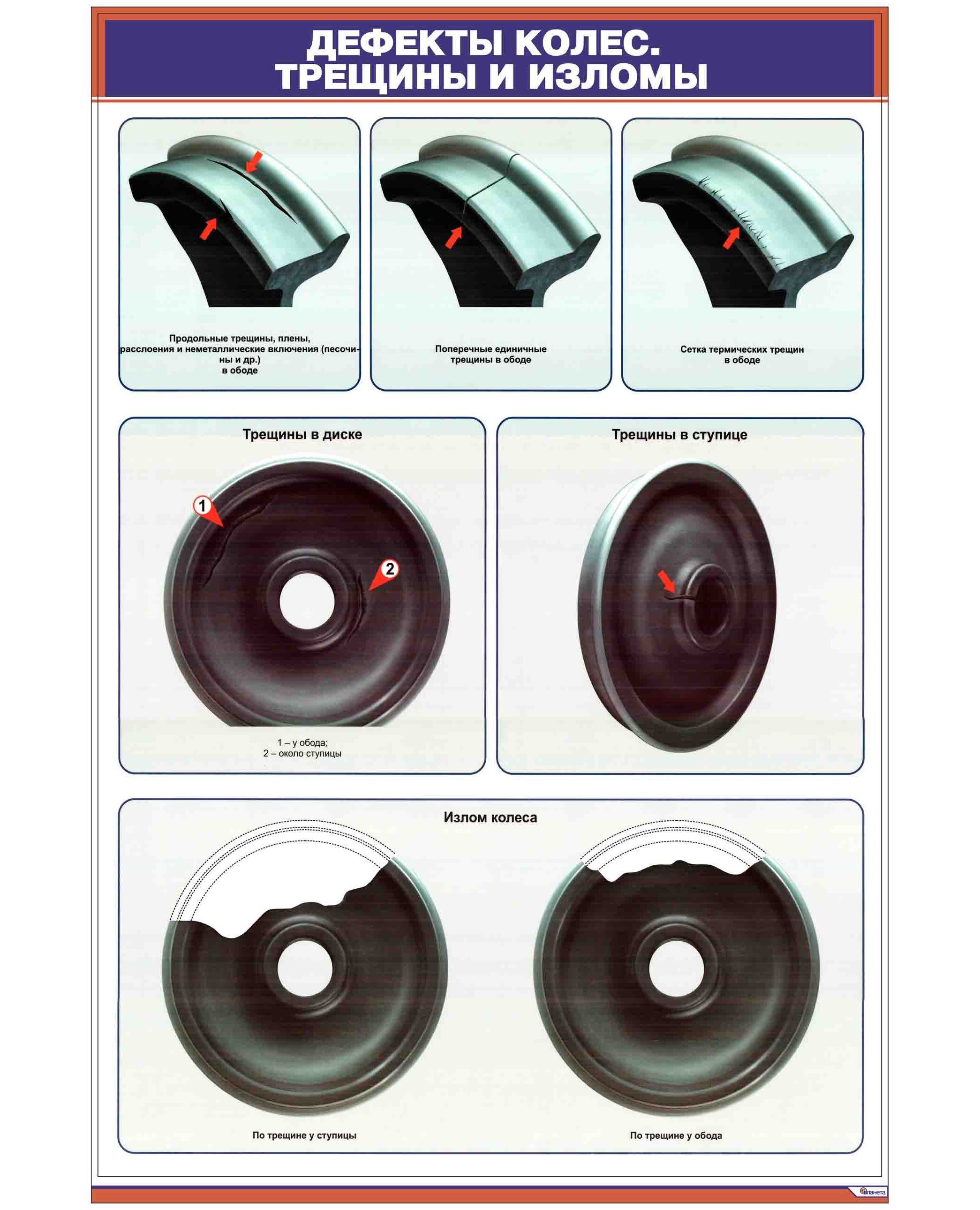 Плакат: Дефекты колес. Трещины и изломы ((600 х 900 мм, ламинированный, с пластиковым профилем и стальным крючком)