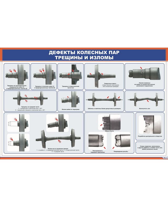 Плакат: Дефекты колесных пар. Трещины и изломы (гориз. 3/3) (900 х 600 мм, ламинированный, с пластиковым профилем и стальным крючком)