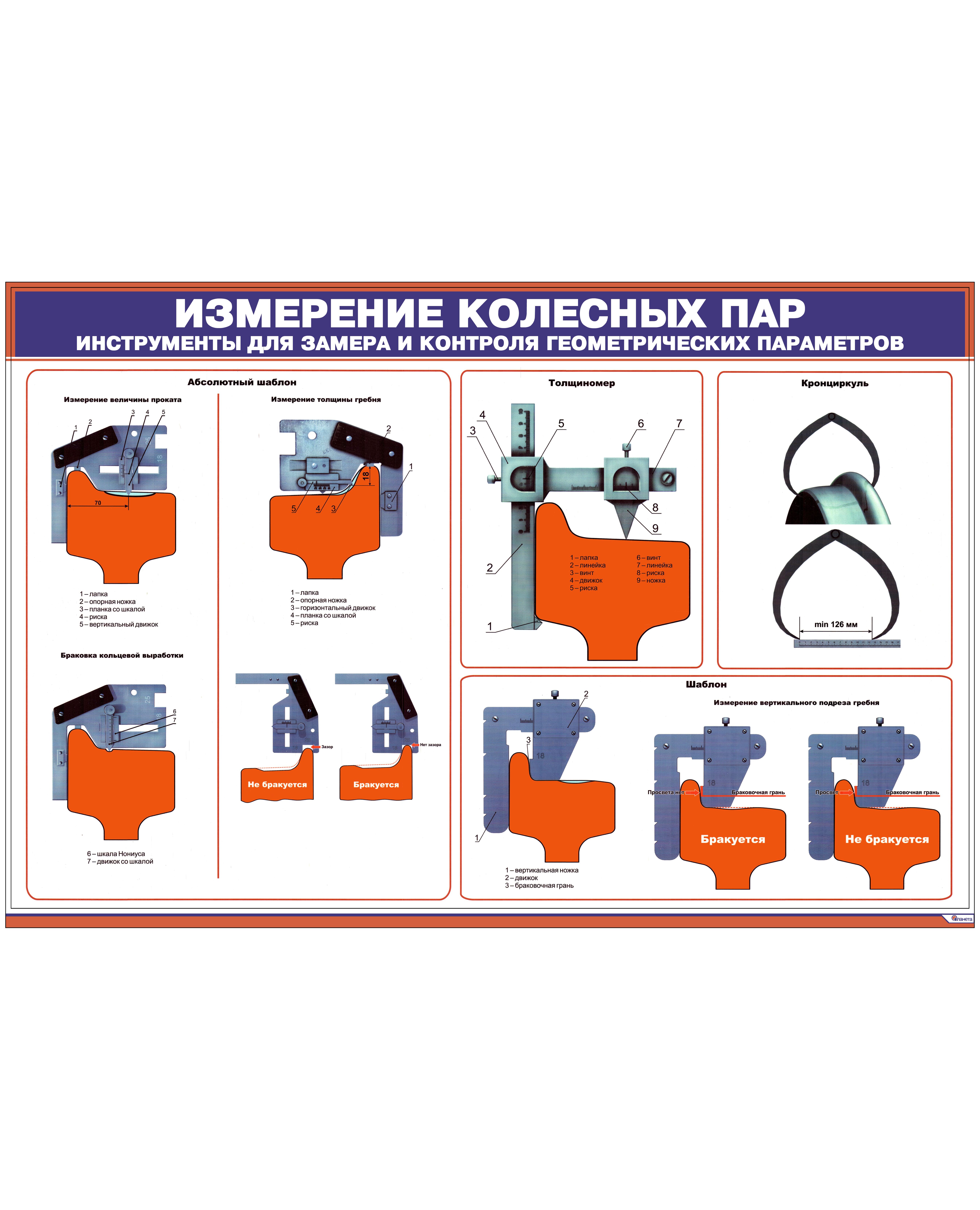 Плакат: Измерение колесных пар. Измерительный инструмент для контроля геометрических параметров 1 (900 х 600 мм, ламинированный с пластиковым профилем стальным крючком)