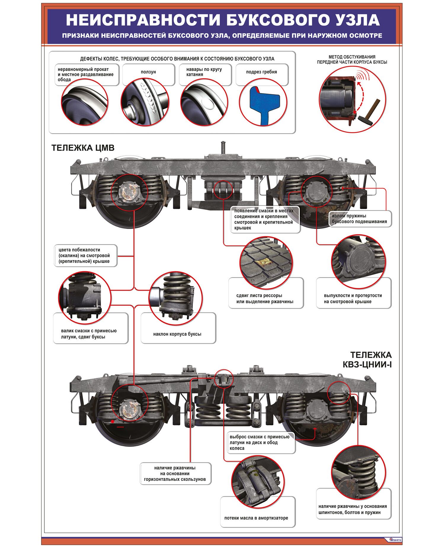 Плакат: Неисправности буксового узла. Признаки неисправностей буксового узла, определяемые при наружном осмотре (600 х 900 мм, ламинированный, с пластиковым профилем и стальным крючком)