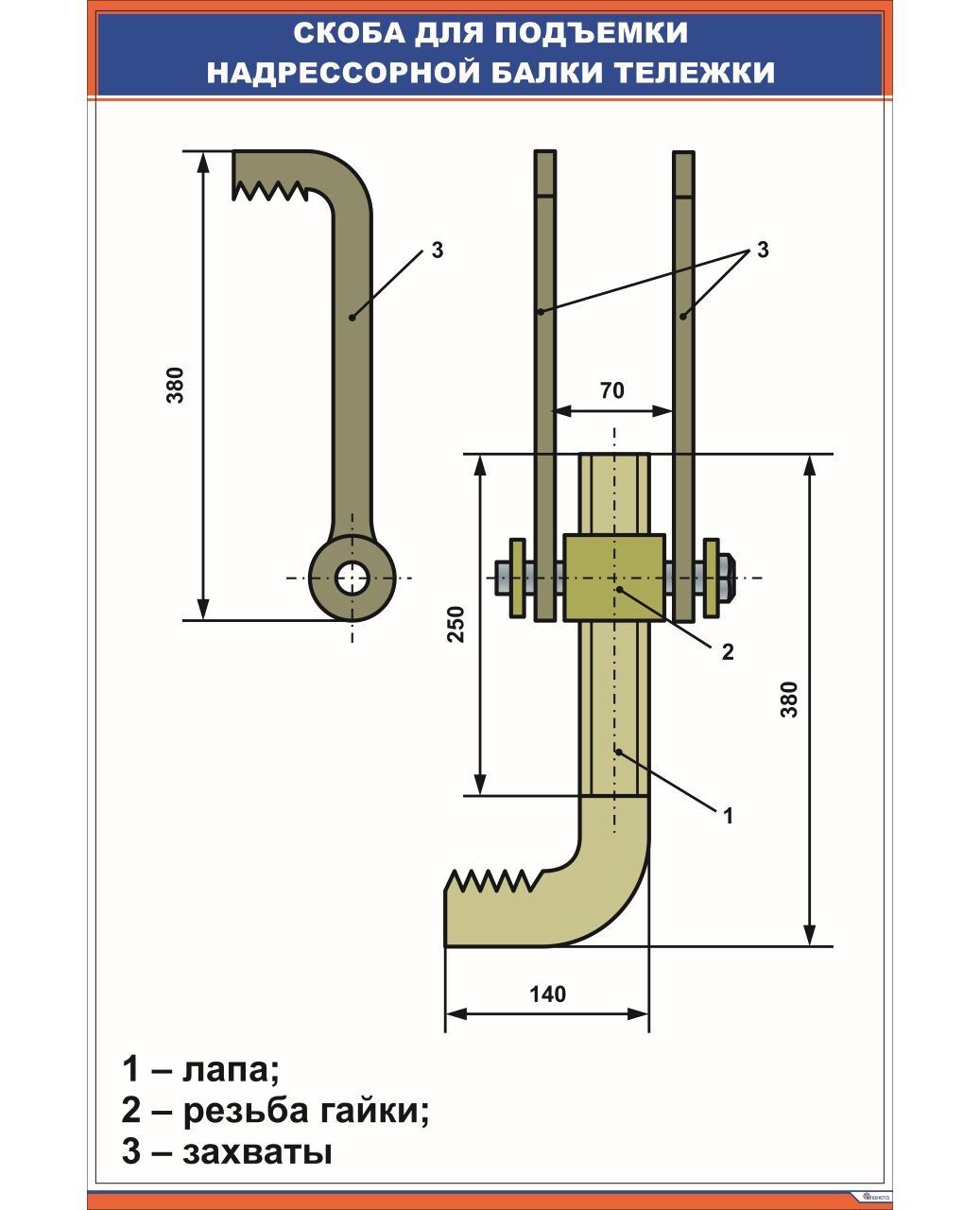 Плакат: Скоба для подъемки надрессорной балки тележки (600 х 900 мм, ламинированный, с пластиковым профилем и стальным крючком)